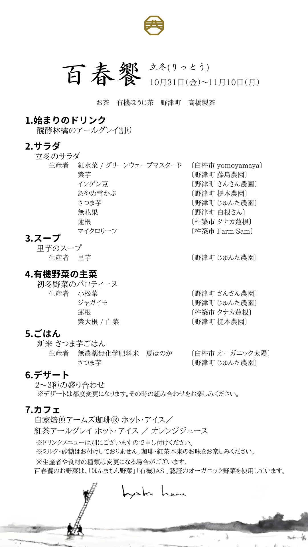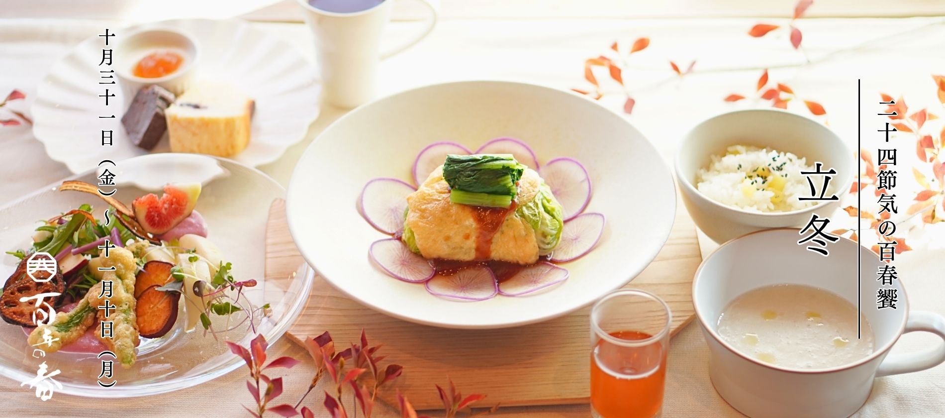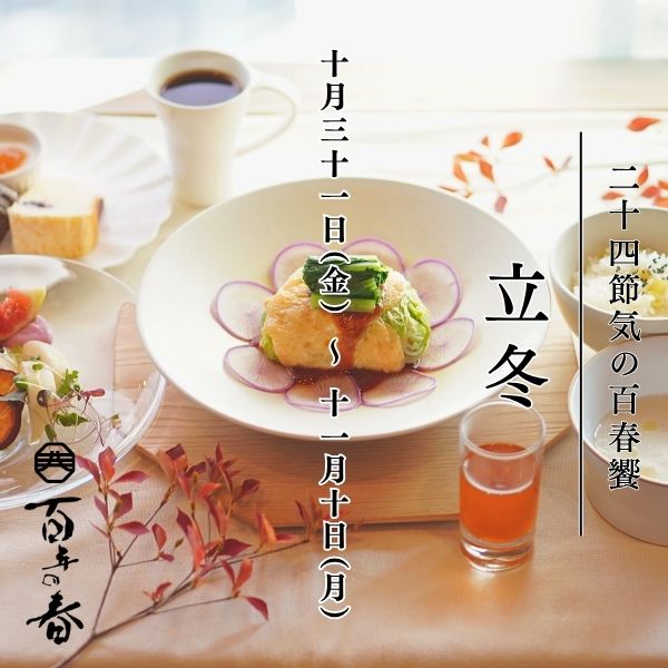 お知らせ 百春饗のお知らせ「立冬(りっとう)」2025-10-30 いつも百年の春をご愛顧いただきまして誠にありがとうございます。 「百春饗」のお知らせです。 百春饗「立冬」の詳しい説明はこちら ご予約は予約フォームから受付けております。 予約フォーム:https://select-type.com/rsv/?id=vH6GEhFbrNw 是非皆様のご来店お待ちしております。