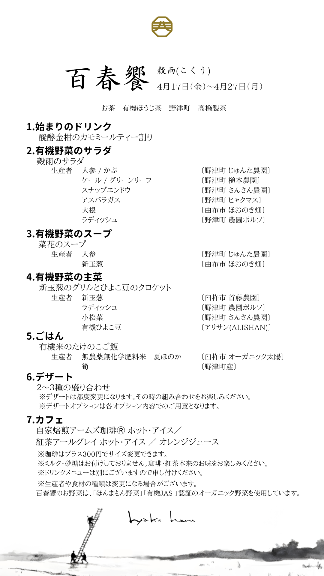 お知らせ 百春饗のお知らせ「穀雨(こくう)」2026-04-15 いつも百年の春をご愛顧いただきまして誠にありがとうございます。 「百春饗」のお知らせです。 百春饗「穀雨」の詳しい説明はこちら ご予約は予約フォームから受付けております。 予約フォーム:https://select-type.com/rsv/?id=vH6GEhFbrNw 是非皆様のご来店お待ちしております。