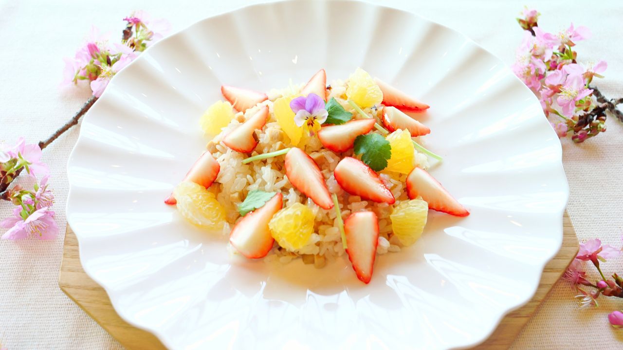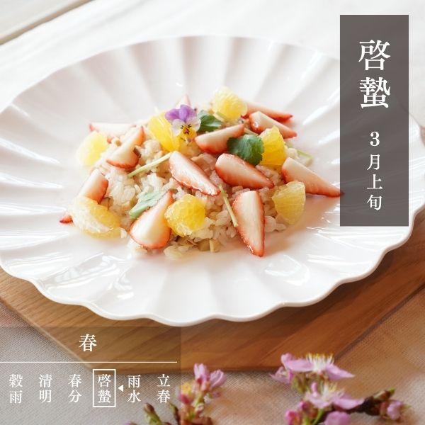 無農薬米「夏ほのか」に、旬を迎えた苺や八朔、文旦をあしらった春色の一皿。苺のビタミンCは美肌を支え、柑橘の爽やかな酸味が疲労回復を促します。甘みと酸味が重なり合い、花咲く野の景色を思わせる華やぎ。啓蟄の光あふれる食卓を締めくくる、心弾むごはんです。