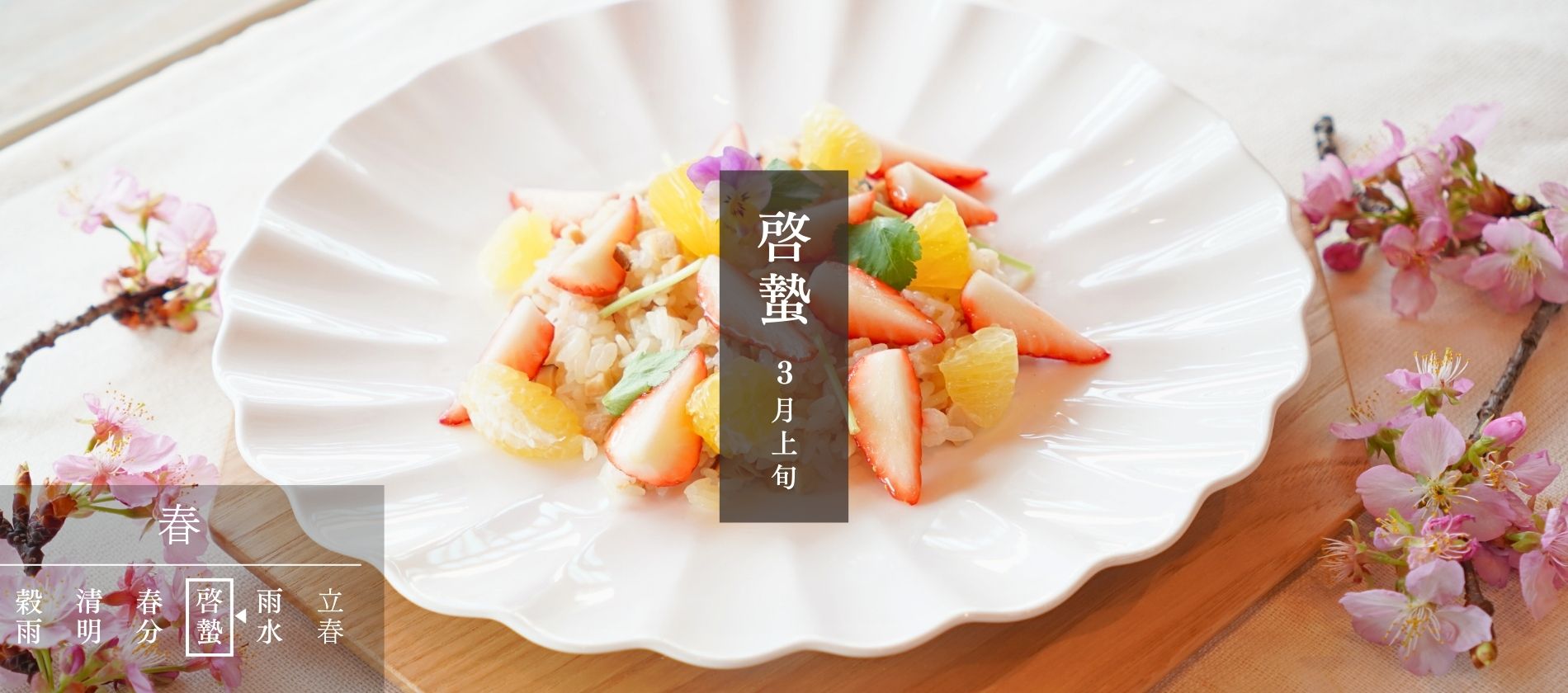 大地がゆるみ、冬眠していた虫たちが土を割って動き出す啓蟄。静けさに包まれていた野山に、芽吹きの息吹が満ちる節気です。百春饗では、ほろ苦い若菜や力強く伸びる春野菜を主役に、目覚めのエネルギーを一皿一皿に込めました。解毒を促す菜の花やケール、巡りを整える柑橘など、有機野菜の生命力が眠っていた身体をやさしく呼び覚まします。春の鼓動を五感でお愉しみください。