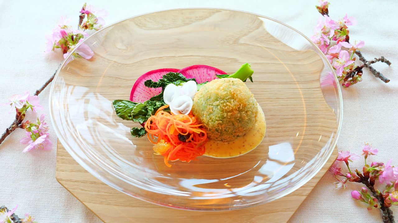 香ばしく揚げたブロッコリーは、外はさくり、中はみずみずしく。ビタミンCやスルフォラファンが解毒を助け、春の養生に最適です。人参や紅くるり大根の甘み、アレッタのほろ苦さが重なり、芽吹きの大地を思わせる一皿に。啓蟄の息吹を閉じ込めた、力強くもやさしい野菜の主菜です。