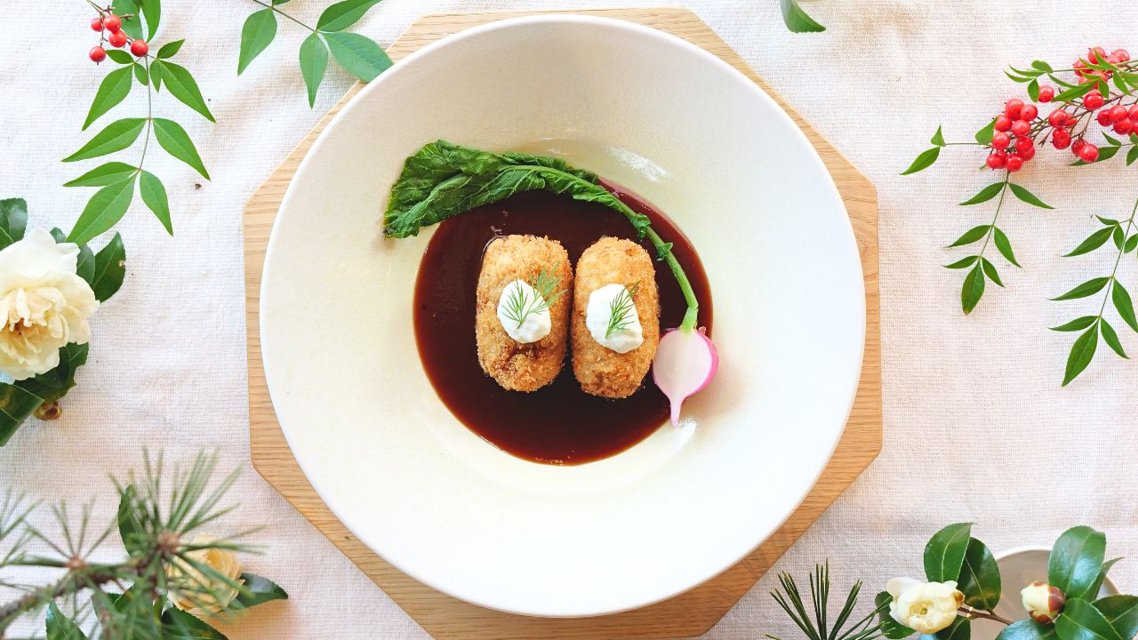「子芋が増える」ことから、縁起物としても親しまれてきた里芋。新年に味わう一皿として、これほどふさわしい野菜はありません。ねっとりとした里芋の食感は、腸を整え、免疫力を支えてくれる冬の滋養。香ばしい衣に包まれたやさしい甘みが、冷えた身体にじんわりと広がります。小寒の“溜める力”と、新年の願いを重ねたクロケットは、一年の健やかさを願う、百年の春ならではの主菜です。