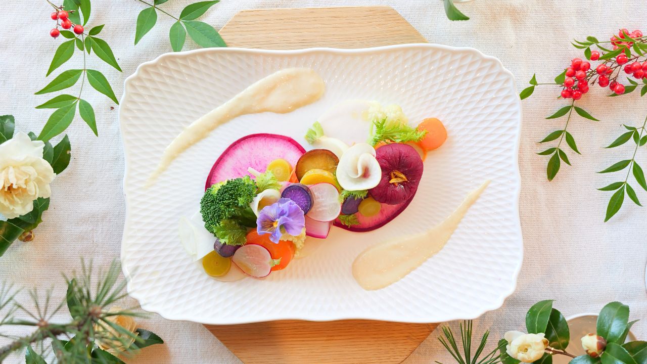 お正月のごちそうの後にこそ味わいたい、身体を整える冬野菜のサラダ。寒さの中で甘みと栄養を蓄えた根菜は、血の巡りを助け、冷えやすい冬の身体を内側から支えてくれます。葉物のほろ苦さは、溜まりがちなものをやさしく流す役割も。小寒は、春へ向かう準備の季節。色とりどりの有機野菜を重ねた一皿は、新年の始まりにふさわしい、清めと滋養を兼ね備えた“食べるお祝い”です。