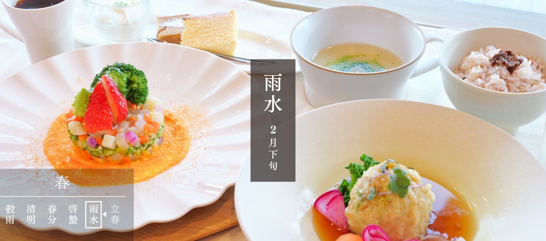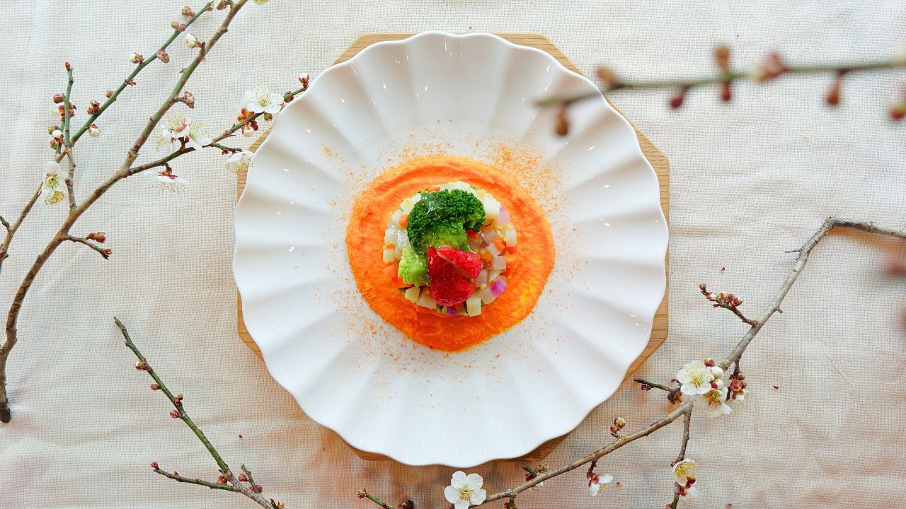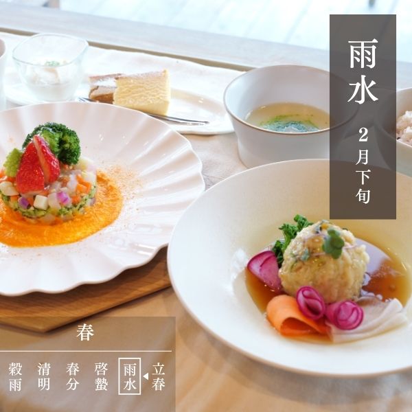 雪解けの大地から顔を出す春色野菜を重ねた一皿。ブロッコリーの抗酸化力、苺のビタミンC、人参のβカロテンが、冬に揺らいだ体調を整えます。大根や紫大根は消化を助け、もちキビは食物繊維で腸内環境をやさしくサポート。みずみずしい人参ソースが全体を包み込み、雨水の潤いを感じる三重奏。春の訪れを、彩りとともに味わってください。