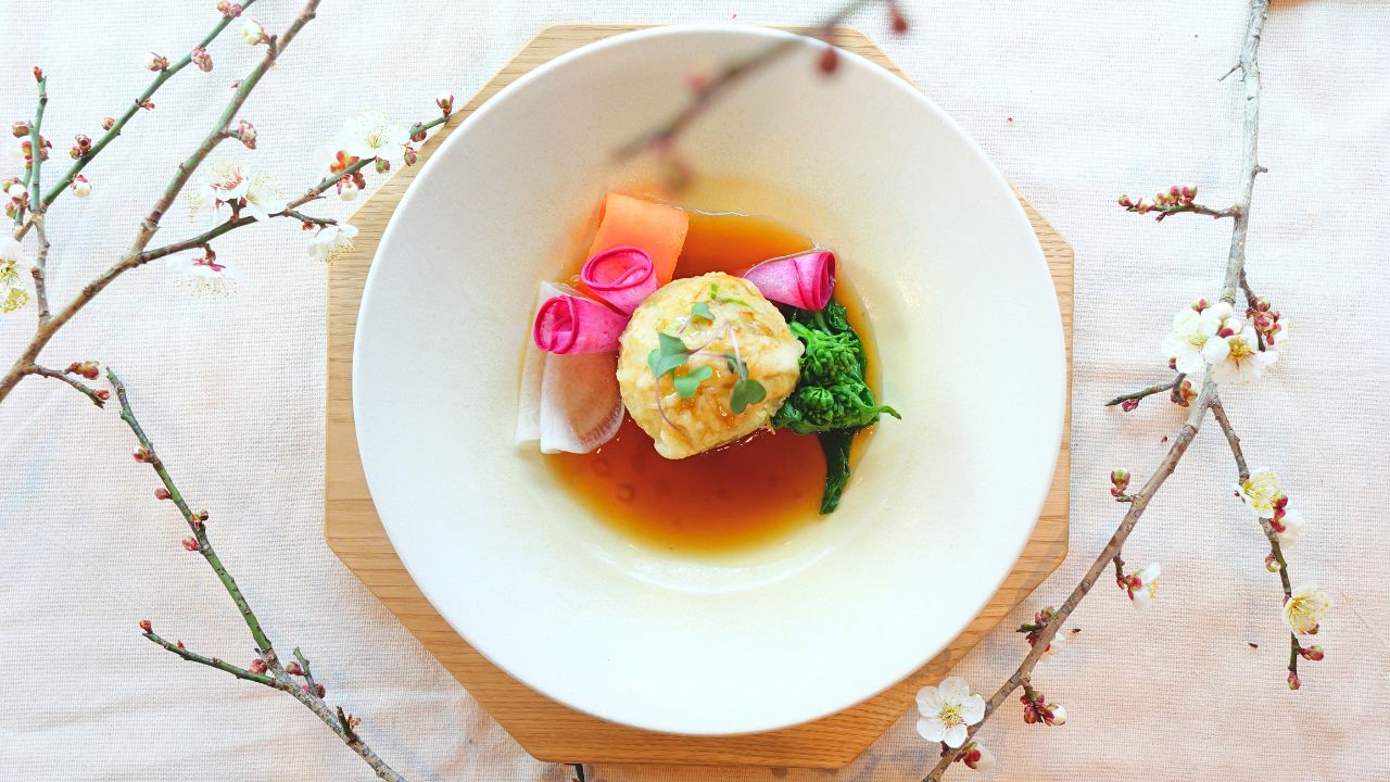 雨水の光を浴びて伸びる菜花やキャベツ、大根、人参を軽やかに揚げ、春の息吹を閉じ込めました。菊芋は食物繊維イヌリンが豊富で腸を整え、生姜は血行を促し身体を温めます。紅くるりの鮮やかな彩りと蒟蒻のやさしい食感が重なり、冬から春へと移ろう力強さを表現。仕上げは、醤油仕立ての柚あんかけ。柚子の香りが立ちのぼり、やわらかな酸味と旨みが揚げ野菜を包み込みます。ひと口ごとに、大地の目覚めを感じていただける主菜です。