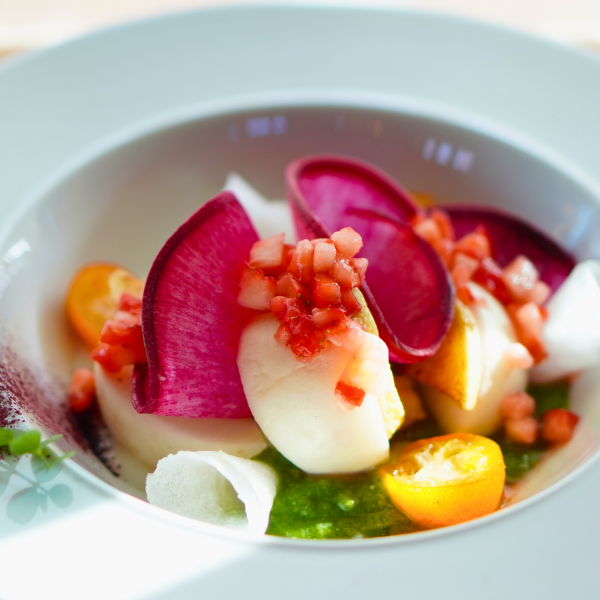 これまで、ほんまもん野菜発祥の地の野津に、ほんまもん野菜を味わえるレストランがなかったです。百年の春のシェフやスタッフが畑に来て、農家と直接話して、それで野菜を見て、仕入れていく。農家が作っている野菜について、料理をする人がお客様に、「こういう風に作っているんですよ」とか、「この農家さんはこういう特徴があって使っています」と話して、理解してもらえる、そういう関係をこれからも続けていきたいと思います。ほんまもん発祥の地の野津に、周りの景色と一緒にほんまもん野菜を味わえるお店ができたことが嬉しいです。年間二十四回変わるメニューでほんまもん野菜の旬を提供できるように応援しています。